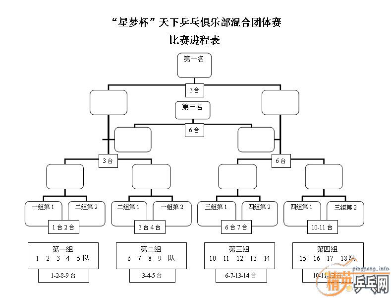 分成了4个小组,各小组及后阶段的比赛台号参见比赛进程表。