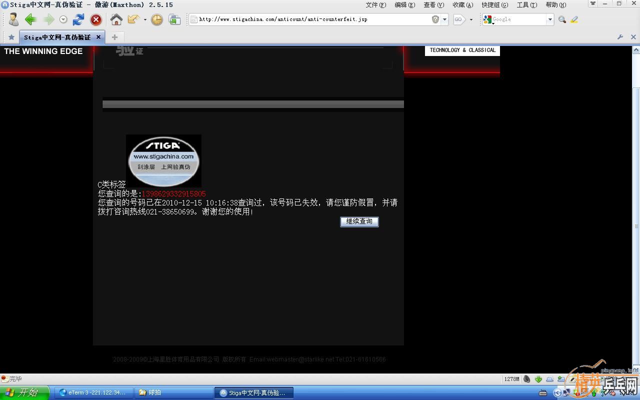 坐4号线再坐小三轮到了沙子口盛购文体四层,找到了北京河北总代理,就在红双喜旁边,他们上网查了查不到,所有在北京销售的行货都从他们这里走货,最后三个人全部仔细看了看确定是正品但不是从他们这里走的货(底板上钢印能查到),他们结论就是要么水货要么从其他地区窜货。蝴蝶的胶片也没有任何问题。