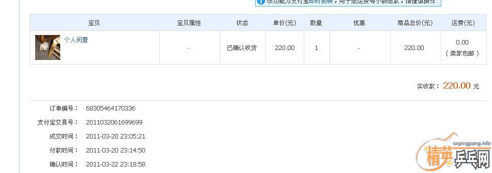 我以前没玩过CL,想试试。通过精英搜索,看到卖家为精英老鸟,还有几个器材贴(http://www.pingpang.info/bbs/viewthread.php?tid=284657&star=1),是玩CL的老鸟,想想老鸟手里的拍子,也该不会太差,就决定买。几次联系,买家都不告诉QQ,淘宝,只能是站内联系,后面我在站内说我决定要那只拍并留下我的手机。当天晚上,他打电话给我,说那是个很不错的拍子,水货,他玩很多CL,这支很不错,绝对对得起这个价格。由于他声称自己没有支付宝,又是老鸟,钱也不多,于是我就网银转给他180.那天是去年农历年腊月二十。快过年的时候快递慢,大概今年初七的样子我才收到板子。附近的球馆没开门,自己看了看,感觉有些问题,但不敢确定。我就发帖告诉他我的发现,卖家引用放在卖拍的帖子上。并承诺“我打过CL有8把,现在只有一把。这把出给甜猪手,该拍在甜猪手大概有20天左右,现在怀疑是假的,我自己确实无法判断,请大家讨论,达成多数意见。如果是假,可退货。”