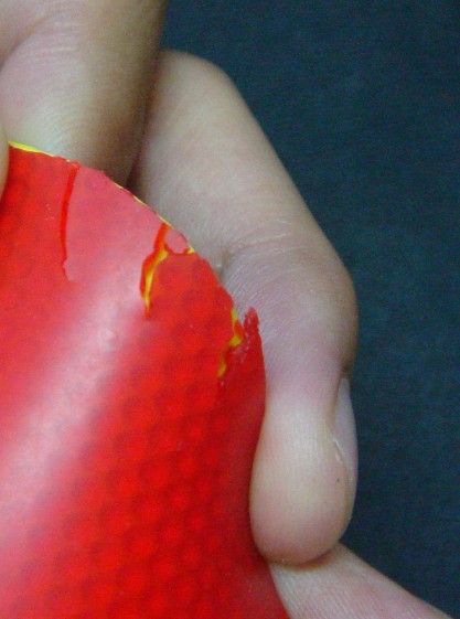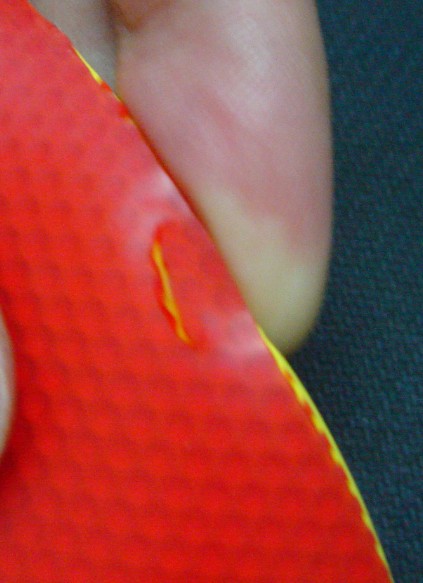 这就是白鲨的伤。一点钟到两点钟方向之间有三道口子,两点到三点中间有些碎边。三点钟有一个口子,印着ITTF90-002那里也有一些伤,手指弄的。