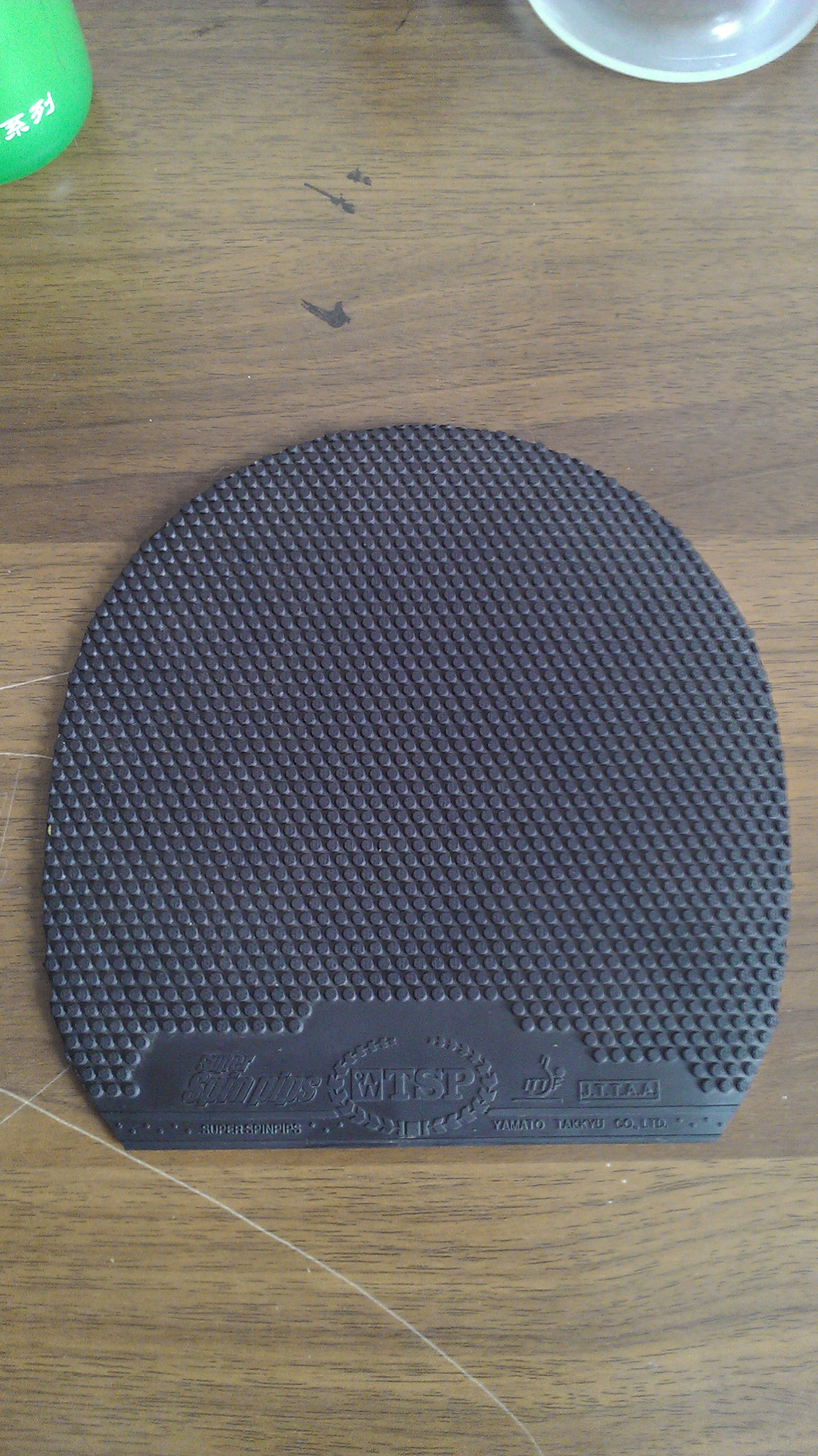 tsp super spinpips 正胶,1.9-2.1。我的第一张颗粒胶,用在直板板面。用的次数不多,但是放的时间较长,反面看起来比较脏,搓了一次搓成这样。50包快,支付宝。