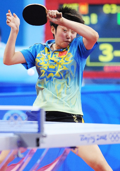 北京,2008年8月14日 (北京奥运)(13)乒乓球——女团小组赛:中国队三战全胜晋级半决赛 8月14日,中国选手郭跃在比赛中以3比1战胜奥地利选手李嫱冰。当日,中国队在北京奥运会乒乓球女子团体A组比赛中以3比0战胜奥地利队,以三战全胜的成绩晋级半决赛。 新华社记者徐家军摄