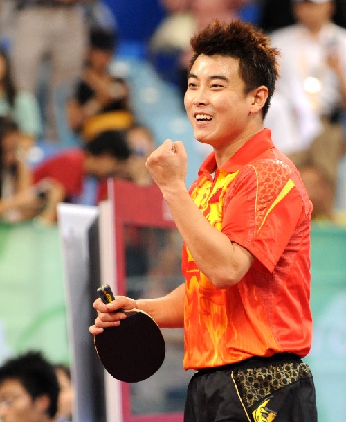 新华社照片,北京,2008年8月16日 (北京奥运)(13)乒乓球——男团:中国挺进决赛 8月16日,中国选手王皓庆祝得分。当日,中国队在北京奥运会乒乓球男团半决赛中以3比0战胜韩国队,挺进决赛,将于18日与德国队争夺金牌。 新华社记者徐昱摄
