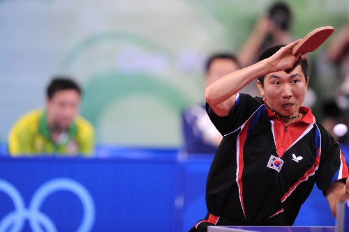 新华社照片,北京,2008年8月17日 (北京奥运)(4)乒乓球——男团:韩国队晋级铜牌争夺战 8月17日,韩国选手柳承敏在比赛中。当日,韩国队在北京奥运会乒乓球男子团体铜牌附加赛中以3比1战胜中国香港队,将于18日与奥地利队争夺铜牌。 新华社记者徐昱摄