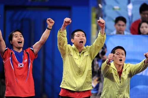 新华社照片,北京,2008年8月17日 (北京奥运)(7)乒乓球——男团:韩国队晋级铜牌争夺战 8月17日,韩国队主教练刘南奎、队员柳承敏、尹在荣(左起)庆祝胜利。当日,韩国队在北京奥运会乒乓球男子团体铜牌附加赛中以3比1战胜中国香港队,将于18日与奥地利队争夺铜牌。 新华社记者徐昱摄