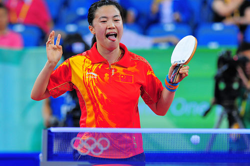 北京时间8月22日20时30分,北京奥运乒乓球女单决赛在北京大学体育馆展开,中国乒坛新老两代女王张怡宁和王楠一决高下。王楠俏皮表情。