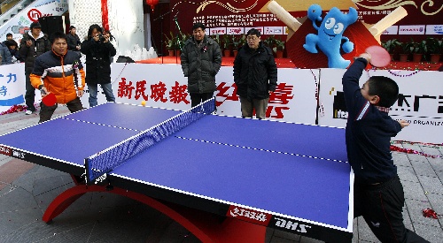 新华社照片,上海,2009年1月10日 (体育)(2)全民健身——上海举行迎新春乒乓球公开赛 1月10日,前世界冠军江嘉良(前左)和小球手在开幕式上表演。当日,由上海市体育总会等单位主办、以“全民健身庆奥运 健康和谐迎世博”为主题的迎新春乒乓球公开赛在上海举行,共有来自全市的1355名市民报名参加。 新华社记者凡军摄