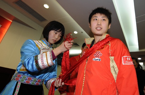 国乒出征世锦赛壮行仪式 为郭跃佩戴羌红