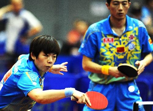 横滨(日本),2009年4月29日 (体育)(10)乒乓球——世乒赛:混双首轮赛况 4月29日,中国选手李平/曹臻(左)在比赛中。当日,李平/曹臻组合在第50届世乒赛混双正选赛首轮中,以4比0战胜新西兰的科尔杜/杨安妮组合,晋级下一轮。 新华社记者徐家军摄