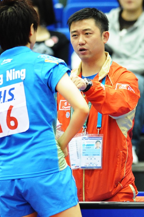 横滨,2009年4月30日 (体育)(3)乒乓球——世乒赛:丁宁晋级 4月30日,中国乒乓球女队教练阎森(右)在场边指导中国选手丁宁。当日,在第50届世乒赛女子单打首轮比赛中,丁宁以4比0战胜哥伦比亚选手梅迪娜,顺利晋级。 新华社记者徐家军摄
