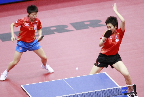 横滨,2009年4月30日 (体育)(4)乒乓球——世乒赛:郭跃/李晓霞晋级 4月30日,中国选手郭跃/李晓霞(右)在比赛中。当日,在第50届世乒赛女双首轮比赛中,郭跃/李晓霞以4比1战胜法国选手格伦迪什/马滕特,顺利晋级。 新华社记者任正来摄