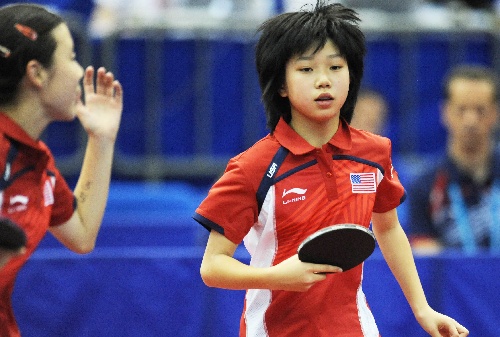 横滨,2009年4月30日   (体育)(10)乒乓球——世乒赛:含苞花蕾亦芬芳 4月30日,美国选手张安(右)和队友邢延华在女双首轮比赛中。今年12岁,还是初一学生的华裔小姑娘张安是第50届世乒赛赛场上年龄最小的参赛选手,她参加了混双、女单和女双三项比赛,并有出色的表现。她在女双比赛中与搭档邢延华成为最年轻的组合。张安来自美国加州圣弗朗西斯科附近的一个小城市。 新华社记者徐家军摄