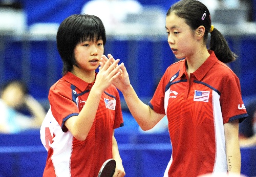 横滨,2009年4月30日   (体育)(9)乒乓球——世乒赛:含苞花蕾亦芬芳 4月30日,美国选手张安(左)和队友邢延华在女双首轮比赛中。今年12岁,还是初一学生的华裔小姑娘张安是第50届世乒赛赛场上年龄最小的参赛选手,她参加了混双、女单和女双三项比赛,并有出色的表现。她在女双比赛中与搭档邢延华成为最年轻的组合。张安来自美国加州圣弗朗西斯科附近的一个小城市。 新华社记者徐家军摄