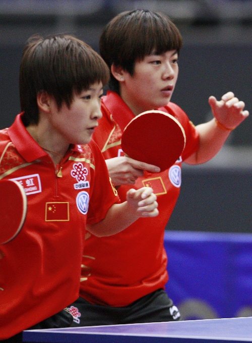 横滨,2009年4月30日 (体育)(3)乒乓球——世乒赛:中国女双选手顺利晋级 4月30日,中国选手曹臻(右)/刘诗雯在比赛中。当日,在日本横滨体育馆进行的第50届世界乒乓球锦标赛女子双打正赛首轮比赛中,曹臻/刘诗雯以4比0战胜印度组合莫玛·达斯/普罗米·加塔。 新华社记者任正来摄