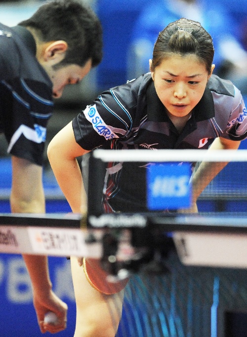 横滨,2009年5月1日 (体育)(4)乒乓球——世乒赛:赛场“夫妻档” 5月1日,日本选手田势邦史/田势美贵江(右)在比赛中。在日本横滨举行的第50届世乒赛混双赛场上,田势邦史/田势美贵江格外引人注目。他们是一对恩爱夫妻,在这个非常需要默契配合的项目中,其“夫妻档”显示出独特的优势,丈夫擅长近台小球控制,而妻子则具备决定胜负的杀伤力。 新华社记者徐家军摄