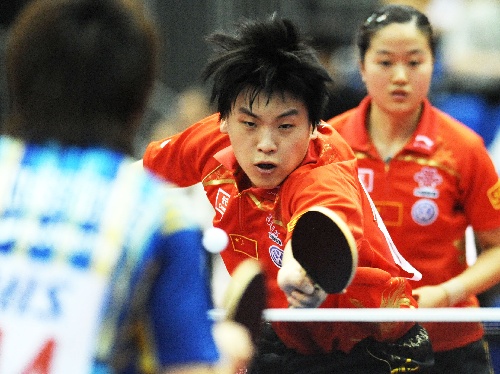 日本横滨,2009年5月1日   (体育)(1)乒乓球——世乒赛:郝帅/常晨晨晋级十六强 5月1日,中国选手郝帅(中)/常晨晨在比赛中。当日,在日本横滨体育馆进行的第50届世界乒乓球锦标赛混合双打第三轮比赛中,郝帅/常晨晨4比3战胜中华台北选手江宏杰/郑怡静,晋级十六强。 新华社记者徐家军摄