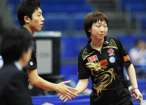 横滨,2009年5月1日 (体育)(5)乒乓球——世乒赛:许昕/范瑛挺进混双八强 5月1日,中国选手许昕和范瑛(右)在比赛后握手致意。当日,在日本横滨体育馆进行的第50届世界乒乓球锦标赛混双第四轮比赛中,许昕/范瑛以4比1战胜法国选手勒古/格兰迪施,晋级八强。 新华社记者徐家军摄