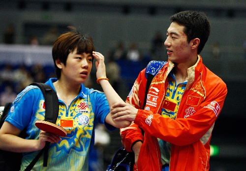 横滨,2009年5月2日 (体育)(14)乒乓球——世乒赛:混双四分之一决赛赛况 5月2日,李平/曹臻(左)在比赛后退场。当日,中国选手李平/曹臻在日本横滨举行的第50届世乒赛混双四分之一决赛中,以4比0战胜队友许昕/范瑛,挺进四强。 新华社记者毕明明摄