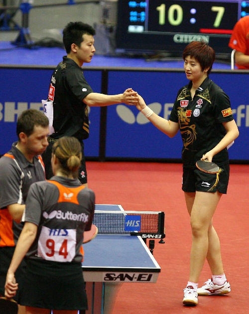 横滨(日本),2009年5月2日 (体育)(24)乒乓球——世乒赛:混双四分之一决赛赛况 5月2日,张超(上左)与姚彦在比赛后击掌庆祝。当日,在日本横滨举行的第50届世乒赛混双四分之一决赛中,中国选手张超/姚彦以4比3战胜斯洛伐克选手皮斯特吉/奥多洛娃,挺进四强。 新华社记者毕明明摄