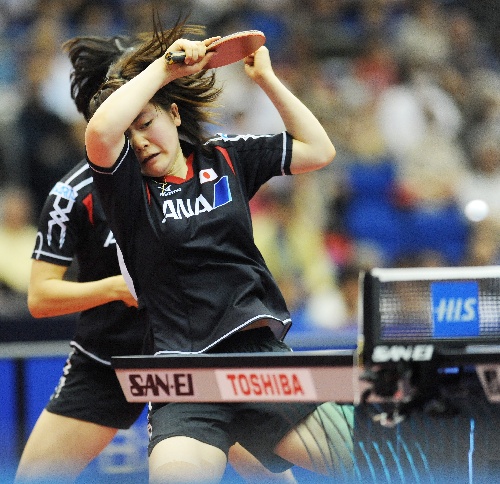 横滨,2009年5月2日 (体育)(8)乒乓球——世乒赛:“瓷娃娃”女双晋级 5月2日,福原爱(前)与平野早矢香在比赛中。当日,在日本横滨举行的第50届世乒赛女双第三轮比赛中,日本选手福原爱/平野早矢香以4比2战胜德国组合沃西/吴佳多,挺进下一轮。 新华社记者徐家军摄