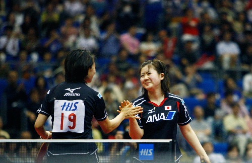 横滨,2009年5月2日 (体育)(5)乒乓球——世乒赛:“瓷娃娃”女双晋级 5月2日,福原爱(右)与平野早矢香在比赛后庆祝。当日,在日本横滨举行的第50届世乒赛女双第三轮比赛中,日本选手福原爱/平野早矢香以4比2战胜德国组合沃西/吴佳多,挺进下一轮。 新华社记者毕明明摄