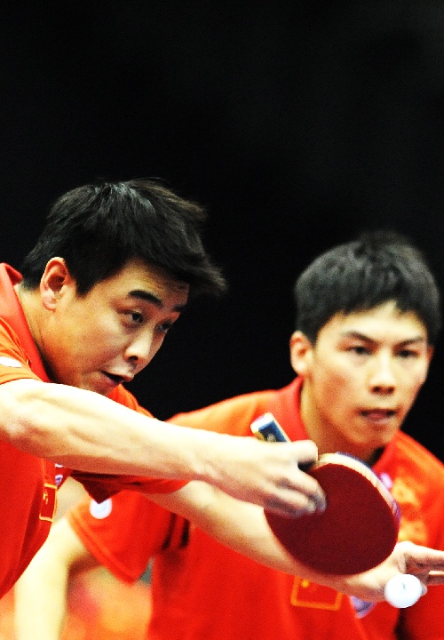 横滨,2009年5月2日 (体育)(3)乒乓球——世乒赛:男双第三轮赛况 5月2日,王皓(左)/陈玘在比赛中。当日,在日本横滨举行的第50届世乒赛男双第三轮比赛中,陈玘/王皓以4比2战胜波兰选手布拉什奇克/王增弈 ,挺进下一轮。 新华社记者徐家军摄