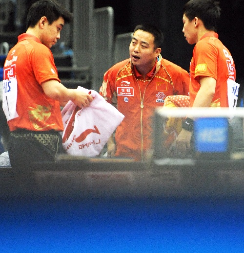 横滨,2009年5月2日 (体育)(5)乒乓球——世乒赛:男双第三轮赛况 5月2日,男队主教练刘国梁(中)向王皓(左)、陈玘布置战术。当日,在日本横滨举行的第50届世乒赛男双第三轮比赛中,陈玘/王皓以4比2战胜波兰选手布拉什奇克/王增弈 ,挺进下一轮。 新华社记者徐家军摄