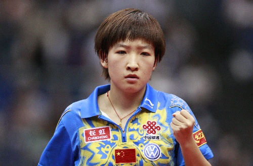 横滨,2009年5月2日 (体育)(10)乒乓球——世乒赛:女单八分之一决赛 5月2日,刘诗雯在获胜后庆祝。当日,在日本横滨举行的第50届世乒赛女单八分之一决赛中,中国选手刘诗雯以4比0战胜队友郭焱,挺进下一轮。 新华社记者任正来摄