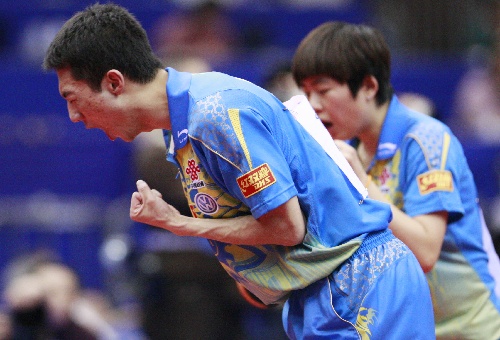 横滨,2009年5月2日 (体育)(1)乒乓球——世乒赛:混双半决赛赛况 5月2日,李平(左)/曹臻在比赛中庆祝得分。当日,在日本横滨举行的第50届世乒赛混双半决赛中,中国选手李平/曹臻以4比2战胜队友张超/姚彦,晋级决赛。 新华社记者任正来摄