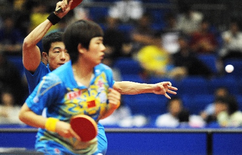 横滨,2009年5月2日 (体育)(9)乒乓球——世乒赛:混双半决赛赛况 5月2日,李平(左)/曹臻在比赛中。当日,在日本横滨举行的第50届世乒赛混双半决赛中,中国选手李平/曹臻以4比2战胜队友张超/姚彦,晋级决赛。 新华社记者徐家军摄