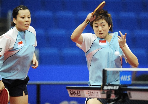 横滨,2009年5月3日 (体育)(12)世乒赛——女子双打四分之一赛况 5月3日,新加坡选手冯天薇(右)/王越古在比赛中。当日,中国香港选手帖雅娜/姜华珺组合在第50届世乒赛女双四分之一决赛中,以4比2战胜新加坡选手冯天薇/王越古组合,晋级四强。 新华社记者徐家军摄