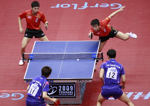 横滨,2009年5月3日 (体育)(1)乒乓球——世乒赛: 男双四分之一决赛赛况 5月3日,中国组合陈玘(左上)/王皓(右上)在比赛中。当日,在第50届世乒赛男双四分之一决赛中,陈玘/王皓以4比2战胜韩国组合吴尚垠(右下)/柳承敏,挺进四强。 新华社记者任正来摄