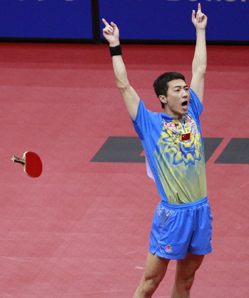 横滨,2009年5月3日 (体育)(3)乒乓球——世乒赛:李平/曹臻混双夺冠 5月3日,中国选手李平在夺冠后扔掉球拍庆祝。当日,在第50届世乒赛混合双打决赛中,李平/曹臻以4比2战胜队友张继科/木子,夺得冠军。 新华社记者任正来摄