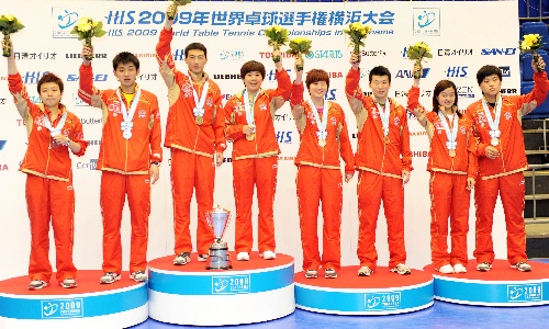 横滨,2009年5月3日 (体育)(3)乒乓球——世乒赛:中国包揽混双奖牌 5月3日,中国选手木子/张继科、李平/曹臻、姚彦/张超、常晨晨/郝帅(从左至右) 在颁奖仪式上。当日,在第50届世乒赛混双决赛中,中国选手李平/曹臻以4比2战胜队友木子/张继科夺冠,木子/张继科获得亚军,姚彦/张超、常晨晨/郝帅获得季军。 新华社记者徐家军摄