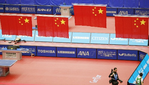 横滨,2009年5月3日 (体育)(5)乒乓球——世乒赛:中国选手包揽混双金银铜 5月3日,一名摄影记者从横滨体育馆升起的四面五星红旗下走过。当日,在第50届世乒赛混双比赛中,中国选手包揽金银铜牌,李平/曹臻夺冠,木子/张继科获得亚军,姚彦/张超、常晨晨/郝帅获得季军。 新华社记者任正来摄