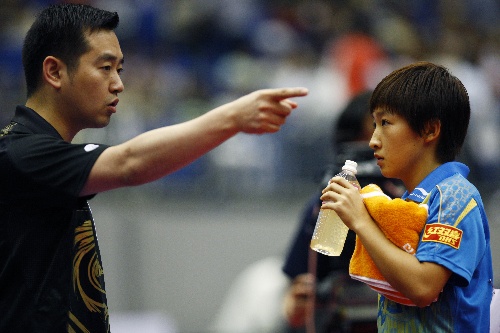 横滨,2009年5月3日 (体育)(5)乒乓球——世乒赛:女单四分之一决赛赛况 5月3日,中国选手刘诗雯(右)在场边接受教练孔令辉的指导。当日,在第50届世乒赛女单四分之一决赛中,刘诗雯以4比1战胜捷克选手瓦采洛夫斯卡,挺进四强。 新华社记者毕明明摄