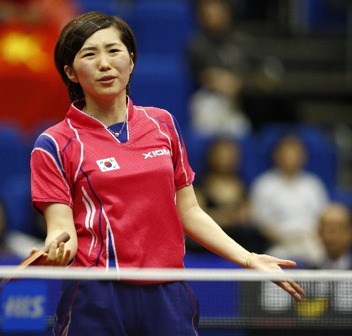横滨,2009年5月3日 (体育)(4)乒乓球——世乒赛:李晓霞晋级女单四强 5月3日,韩国选手唐汭序在比赛中。当日,在日本横滨体育馆进行的第50届世界乒乓球锦标赛女子单打四分之一决赛中,中国选手李晓霞以4比1战胜韩国选手唐汭序,晋级四强。 新华社记者毕明明摄