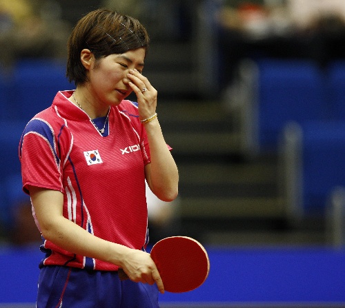 横滨,2009年5月3日 (体育)(5)乒乓球——世乒赛:李晓霞晋级女单四强 5月3日,韩国选手唐汭序在比赛中。当日,在日本横滨体育馆进行的第50届世界乒乓球锦标赛女子单打四分之一决赛中,中国选手李晓霞以4比1战胜韩国选手唐汭序,晋级四强。 新华社记者毕明明摄