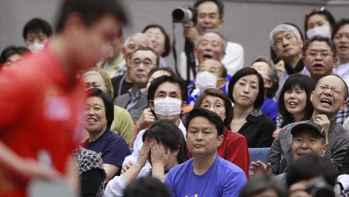 横滨,2009年5月3日 (体育)(7)乒乓球——世乒赛: 男单四分之一决赛赛况 5月3日,在中国选手王皓得分后,看台上的日本观众表情各异。当日,王皓在第50届世乒赛男单四分之一决赛中,以4比1战胜日本选手吉田海伟,挺进四强。 新华社记者任正来摄
