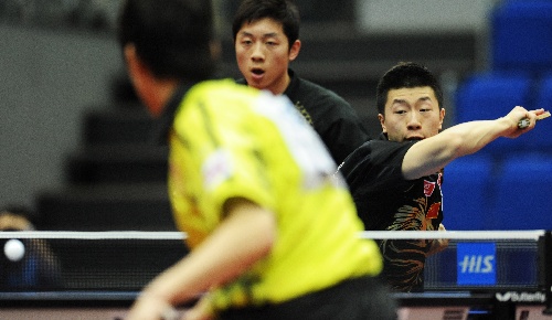 横滨,2009年5月3日 (体育)(4)乒乓球——世乒赛男子双打四分之一赛况 5月3日,中国选手马龙(右)/许昕在比赛中。当日,马龙/许昕在第50届世乒赛男双四分之一决赛中,以4比1战胜中国香港选手唐鹏/江天一,晋级四强。 新华社记者徐家军摄