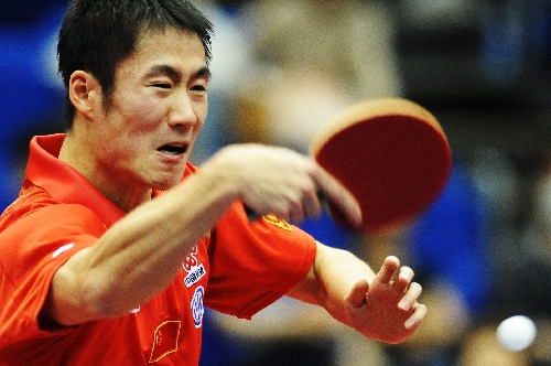 横滨,2009年5月3日 (体育)(4)乒乓球——世乒赛:王励勤晋级四强 5月3日,中国选手王励勤在比赛中击球。当日,王励勤在第50届世乒赛男单四分之一决赛中,以4比3战胜队友陈玘,晋级四强。 新华社记者徐家军摄