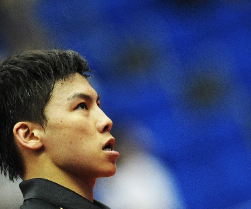 横滨,2009年5月3日 (体育)(9)乒乓球——世乒赛:陈玘无缘四强 5月3日,中国选手陈玘在比赛中。当日,陈玘在第50届世乒赛男单四分之一决赛中,以3比4不敌队友王励勤,无缘四强。 新华社记者徐家军摄