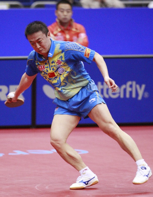 横滨,2009年5月3日 (体育)(7)乒乓球——世乒赛:马琳闯入四强 5月3日,中国选手马琳(右)在比赛中回球。当日,马琳在第50届世乒赛男单四分之一决赛中,以4比2战胜韩国选手朱世爀,晋级四强。 新华社记者任正来摄