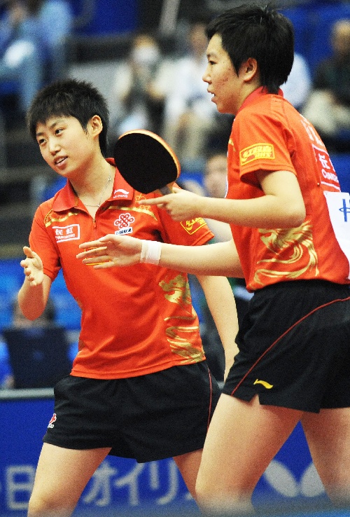 横滨,2009年5月4日 (体育)(4)乒乓球——世乒赛:郭跃、李晓霞挺进女双决赛 5月4日,郭跃(左)与李晓霞在比赛中庆祝得分。当日,在日本横滨举行的第50届世乒赛女子双打半决赛中,中国选手郭跃/李晓霞以4比0战胜中国香港选手姜华珺/帖雅娜,挺进决赛。 新华社记者徐家军摄