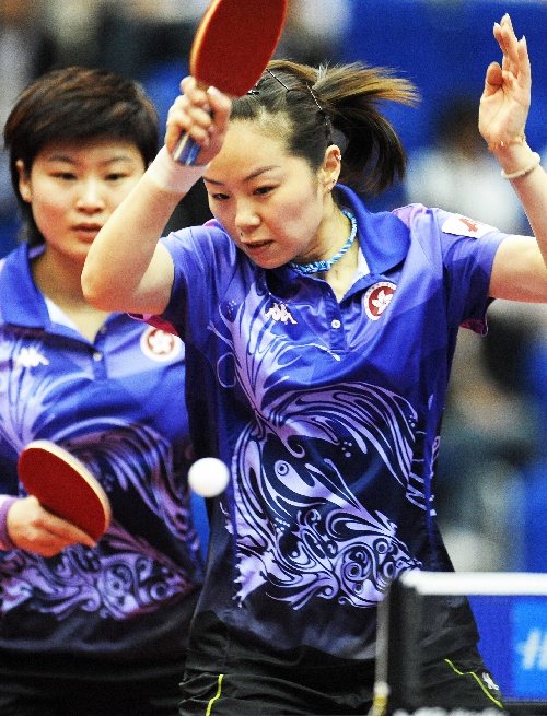 横滨,2009年5月4日 (体育)(1)乒乓球——世乒赛女双半决赛:姜华珺/帖雅娜出局 5月4日,姜华珺/帖雅娜(右)在比赛中。当日,在日本横滨举行的第50届世乒赛女子双打半决赛中,中国香港选手姜华珺/帖雅娜以0比4不敌中国选手郭跃/李晓霞,无缘决赛。 新华社记者徐家军摄