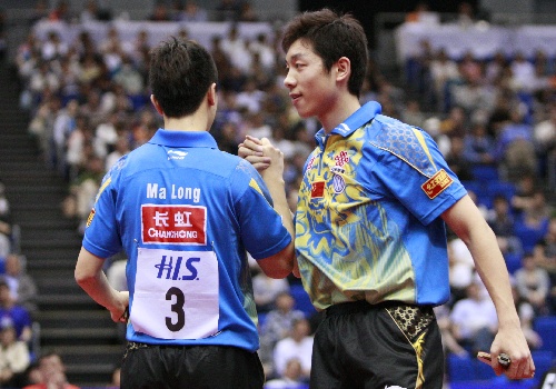 横滨,2009年5月4日 (体育)(1)乒乓球——世乒赛:马龙/许昕挺进决赛 5月4日,马龙/许昕(右)在比赛获胜后庆祝。当日,在日本横滨举行的第50届世乒赛男子双打半决赛中,中国选手马龙/许昕以4比0战胜日本选手岸川圣也/水谷隼,挺进决赛。 新华社记者任正来摄