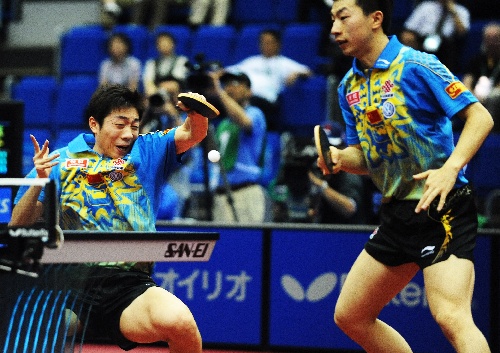 横滨,2009年5月4日 (体育)(5)乒乓球——世乒赛:马龙/许昕挺进决赛 5月4日,马龙/许昕(左)在比赛中。当日,在日本横滨举行的第50届世乒赛男子双打半决赛中,中国选手马龙/许昕以4比0战胜日本选手岸川圣也/水谷隼,挺进决赛。 新华社记者徐家军摄