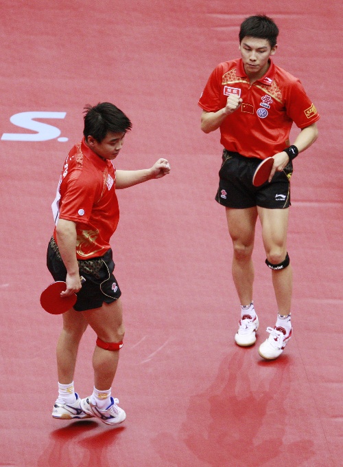 横滨,2009年5月4日 (体育)(10)乒乓球——世乒赛:陈玘/王皓夺得男双冠军 5月4日,中国选手陈玘(右)/王皓在比赛中庆祝得分。当日,在第50届世界乒乓球锦标赛男子双打决赛中,陈玘/王皓以4比1战胜队友马龙/许昕,夺得冠军。 新华社记者任正来摄