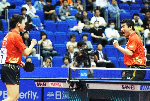 横滨,2009年5月4日 (体育)(11)乒乓球——世乒赛:陈玘/王皓夺得男双冠军 5月4日,中国选手陈玘/王皓(右)庆祝胜利。当日,在第50届世界乒乓球锦标赛男子双打决赛中,陈玘/王皓以4比1战胜队友马龙/许昕,夺得冠军。 新华社记者徐家军摄