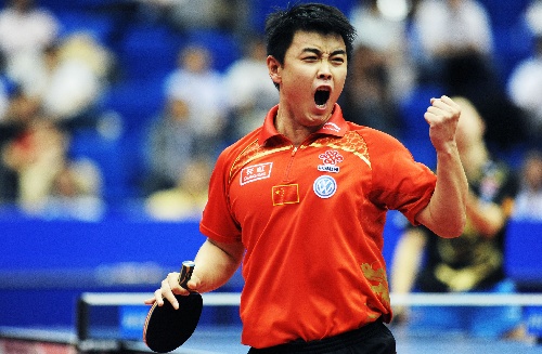 横滨,2009年5月4日 (体育)(13)乒乓球——世乒赛:王皓晋级男单决赛 5月4日,中国选手王皓庆祝胜利。当日,在第50届世界乒乓球锦标赛男子单打半决赛中,中国选手王皓以4比1战胜队友马龙,晋级决赛。 新华社记者徐家军摄